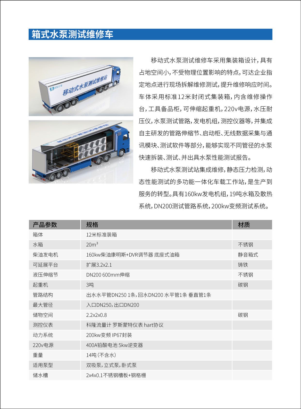1.集裝箱式移動測試車:集成了測試、維修的整套系統(tǒng),包括水箱、管路、流量計、壓力計、測控系統(tǒng),實現(xiàn)現(xiàn)場測試及維修。